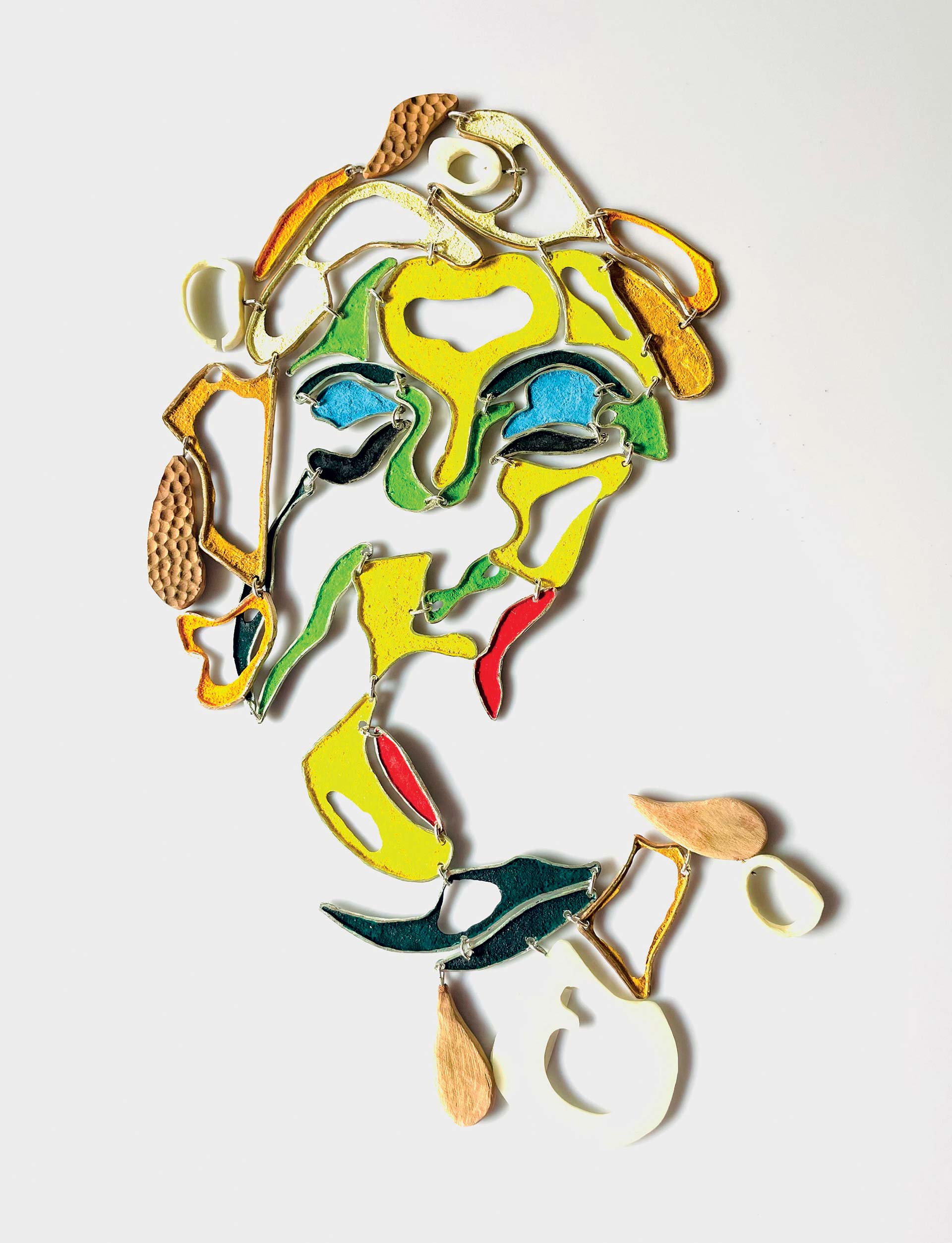 Zu sehen in der Ausstellung Kettenreaktion anlässlich des 100-jährigen Jubiläums der GEDOK in München, 4.3.–17.4.2026. Kirsten Plank, Halsschmuck/Portrait Marylin – broken beauty, 2023. Silber, Bronze, Pigment, Holz, Knochen. © Kirsten Plank.