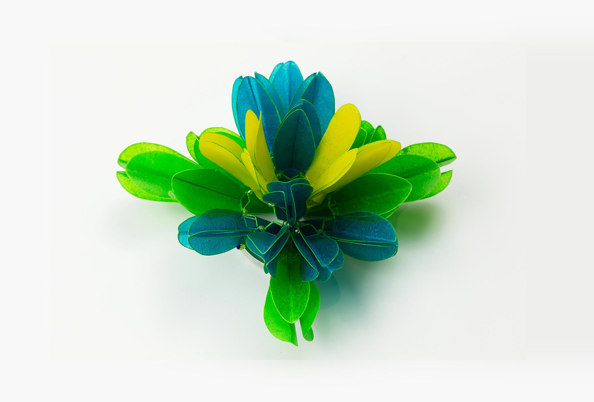 Christine Demmel, Brosche Freigeist, 2025. Pergament, antike Glasperlen, synthetischer Faden, Silber, Edelstahl. Zu sehen auf der Handwerk & Design, JAC jewellery art concept, Stand B1.746. © Christine Demmel.
